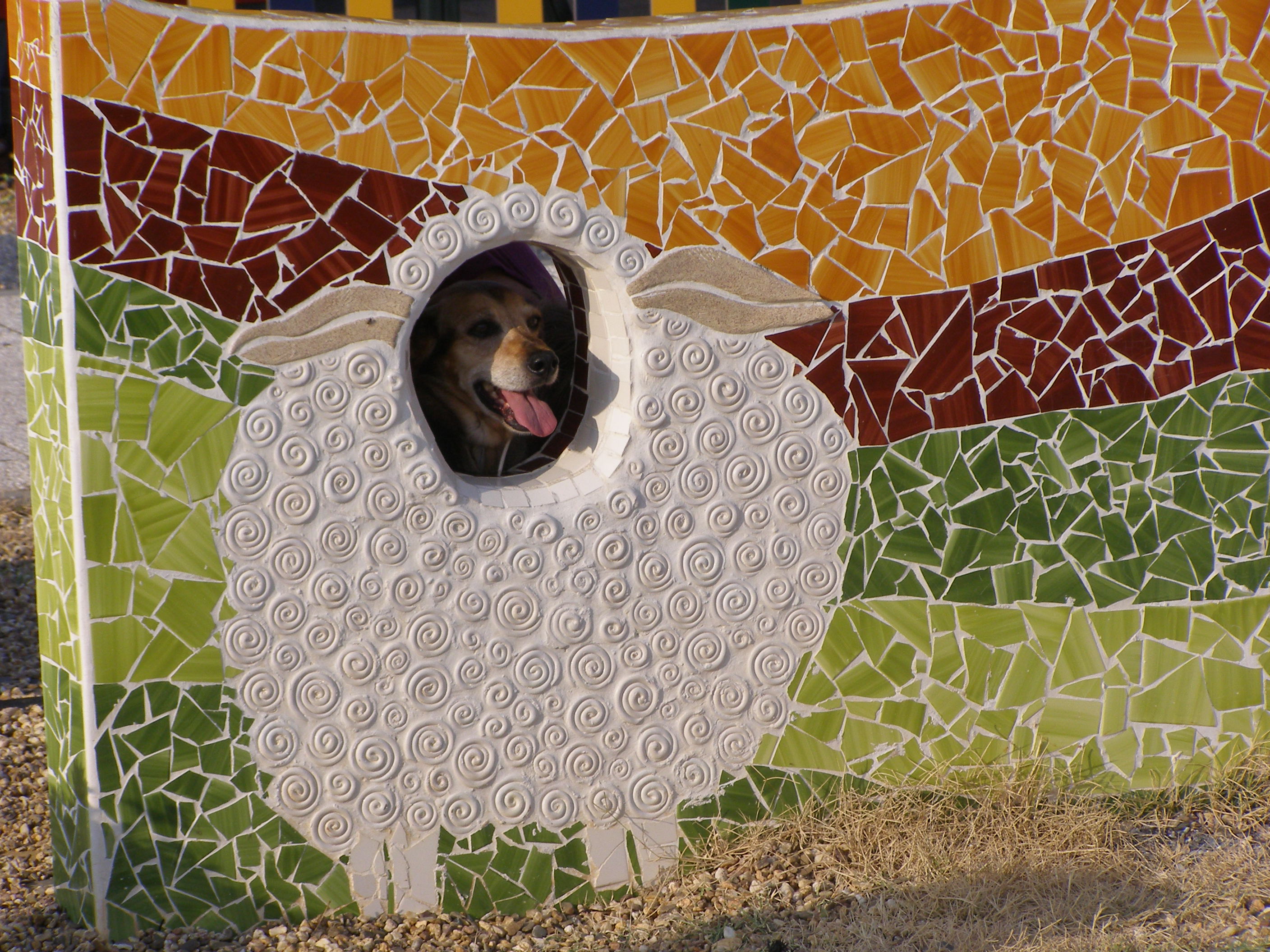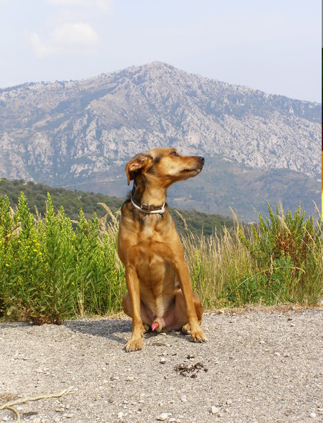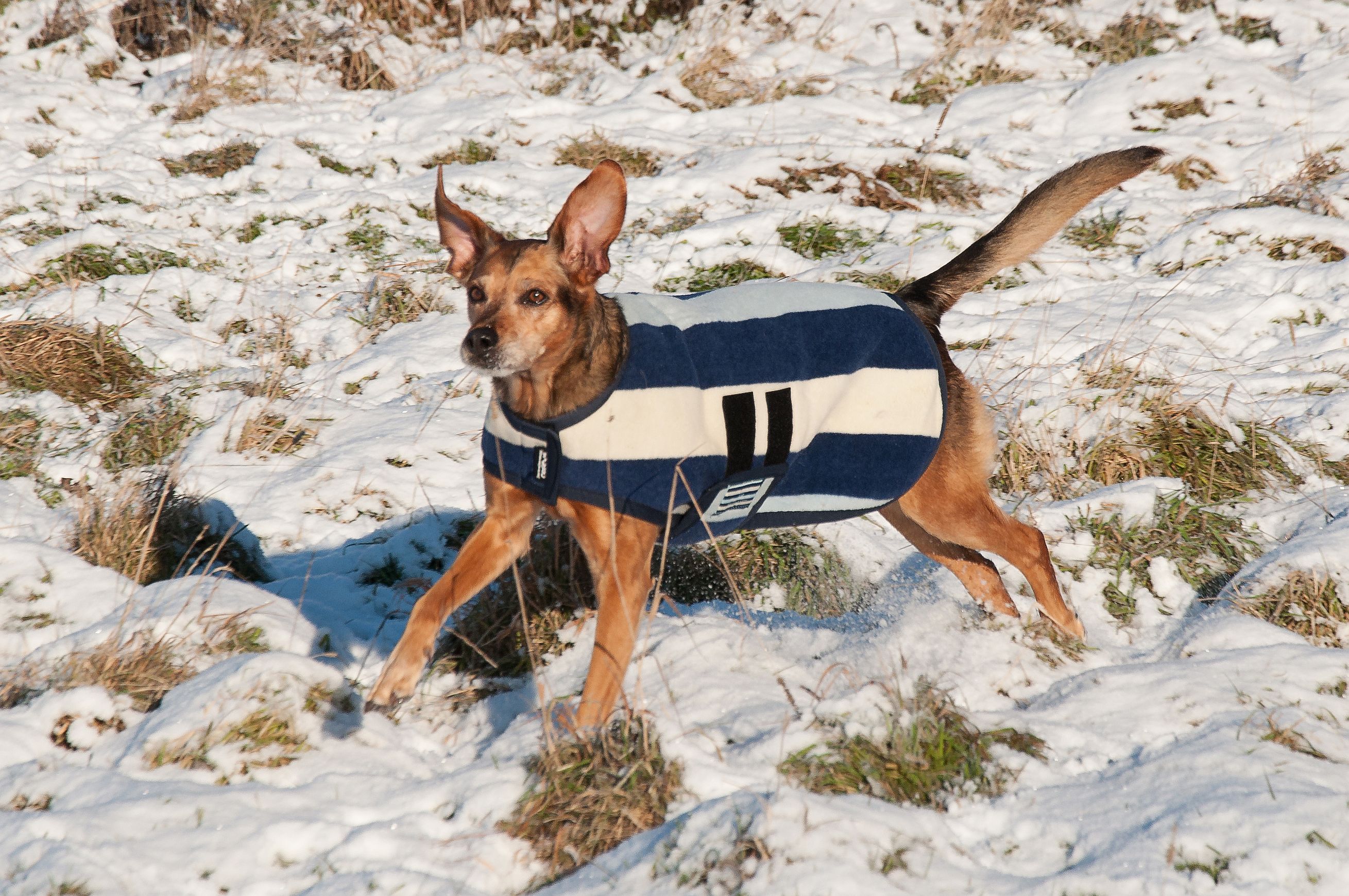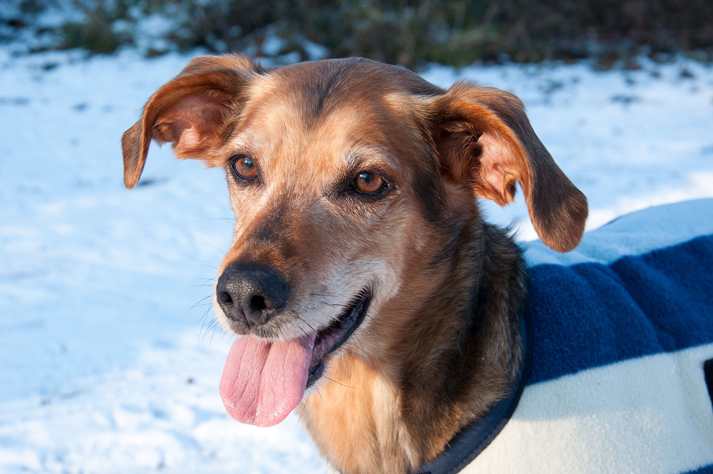 Frida arrived one November day on the Happy Bus, and promptly redecorated the garden. She had been too frightened to either urinate or defecate during the 3-day trip. She was severely underweight and terrified of everything. Getting her to either enter or to leave the house required endless patience. She was far too jumpy to be off the lead outside, but had never been walked on a lead before, so the slightest tension on the cord provoked a flight reflex – there were a number of near misses before we found a harness she could not reverse out of. She is missing a third of her tail – your guess is as good as mine, and has an overlarge nictitating membrane which gives her an appearance as goofy as her personality and I’m sure does not help mitigate her over-sensitive startle reflexes.