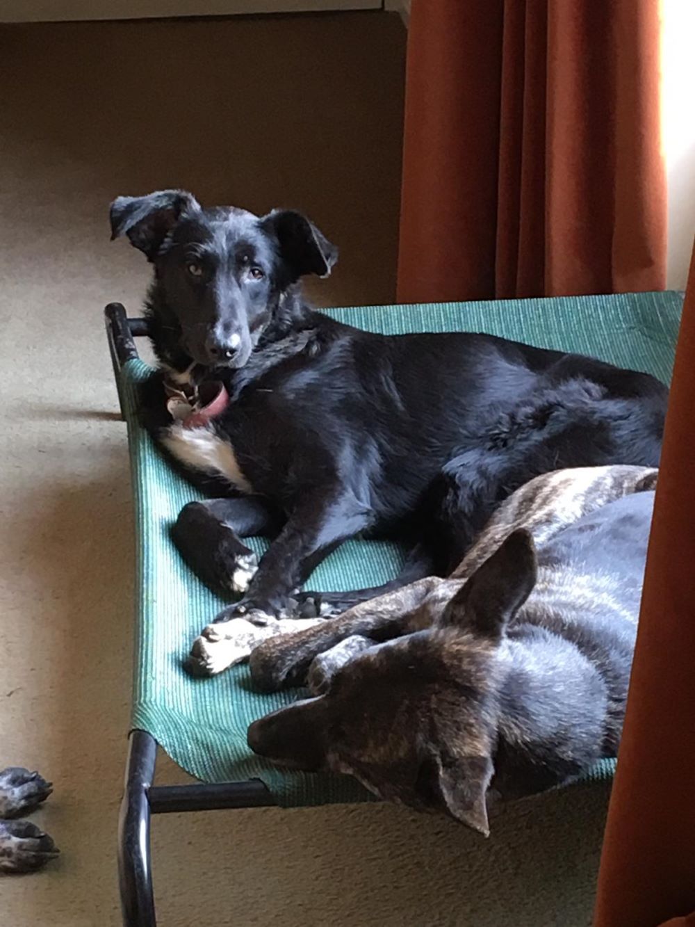A year after Nora arrived, my eye was caught by another dog, the dog that would lead to the aforementioned dressing down. The photos showed a long black face peering sadly out from between the bars of the cage she had been banished to for her own protection when the other dogs in the centre started behaving aggressively towards her. Frida (previously Lovely) was approximately three years old, and had appeared one day at the gate of the shelter. Had she been abandoned there? Had self-preservation led her in the right direction? We will never know.